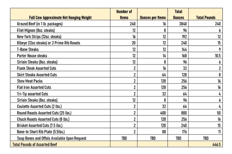Depending on the animal, finishing, and the meat processor customers can expect 59% to optimally 62% of processed “Take Home” beef. 750lbs of hanging weight will render ~442lbs to ~465lbs of “Take Home” processed beef weight.