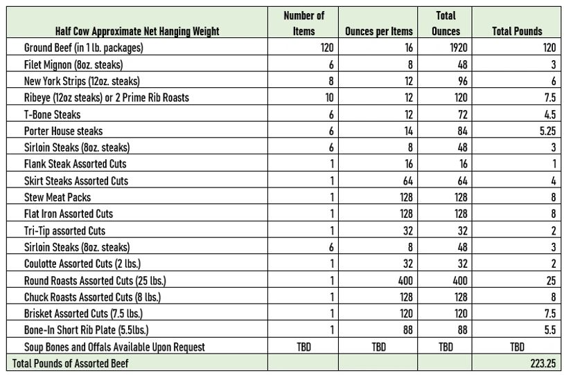 Here is an example Half Cow Order: